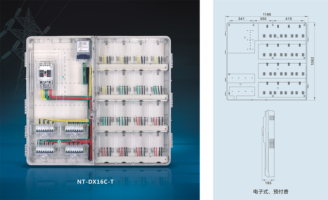 電表箱生產(chǎn)廠家-浙江南騰電氣有限公司研發(fā)的NT系列透明塑料電表箱,采用進(jìn)口聚碳酸酯(PC)和阻燃ABS工程塑料制成。具有抗沖擊、抗老化、耐腐蝕、透明度高、抗紫外線、安裝方便等優(yōu)點(diǎn),并且具有用電安全保護(hù),用戶分離控制,數(shù)據(jù)采集, 防盜電等功能。產(chǎn)品適合安裝電子式、機(jī)械式、智能IC卡預(yù)付式、智能多費(fèi)率式電表。南騰NT系列透明塑料電表箱自推出市場(chǎng)以來,憑借其完美的設(shè)計(jì)理念,在電表箱行業(yè)遙遙領(lǐng)先。
